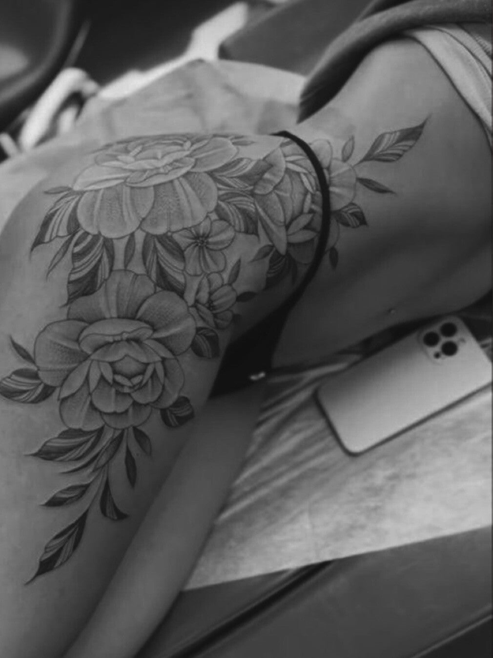 Des motifs floraux et des ornements complexes pour un tatouage riche en détails.